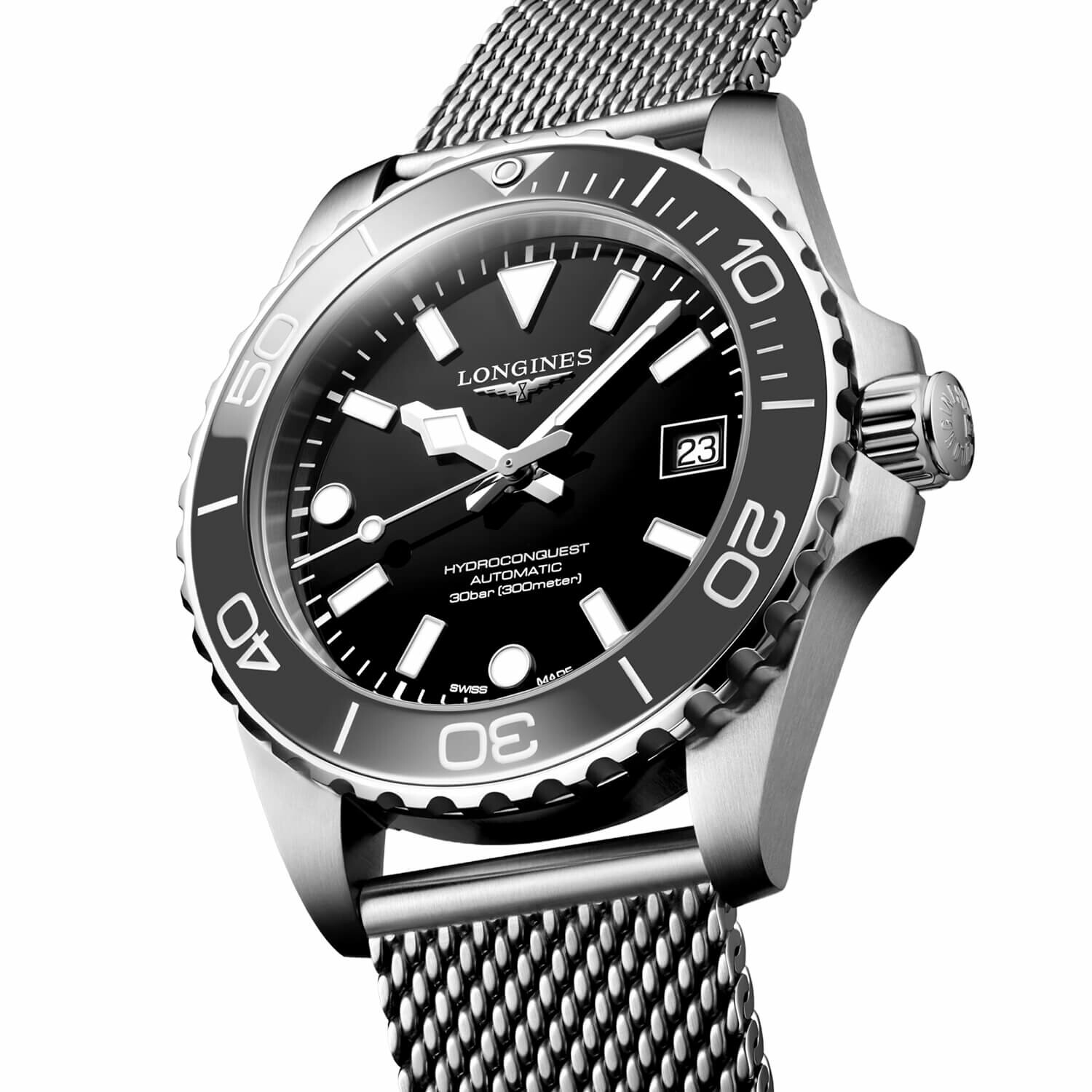 Résolumment sportive, cette montre Longines HydroConquest à cadran noir et lunette céramique gris anthracite sur bracelet mesh (maille milanaise) revisite l’ADN de la montre de plongée avec une touche résolument vintage et contemporaine à la fois.