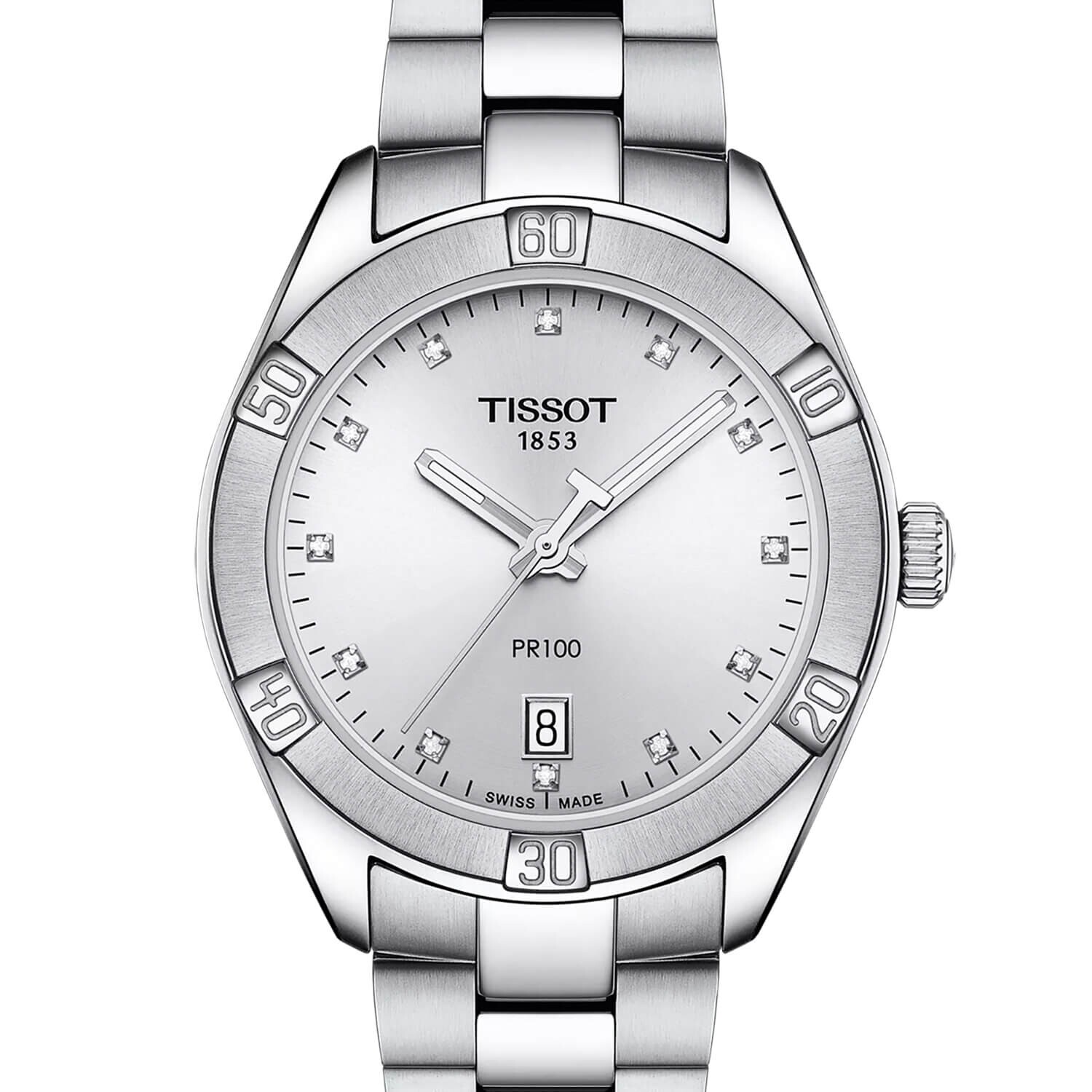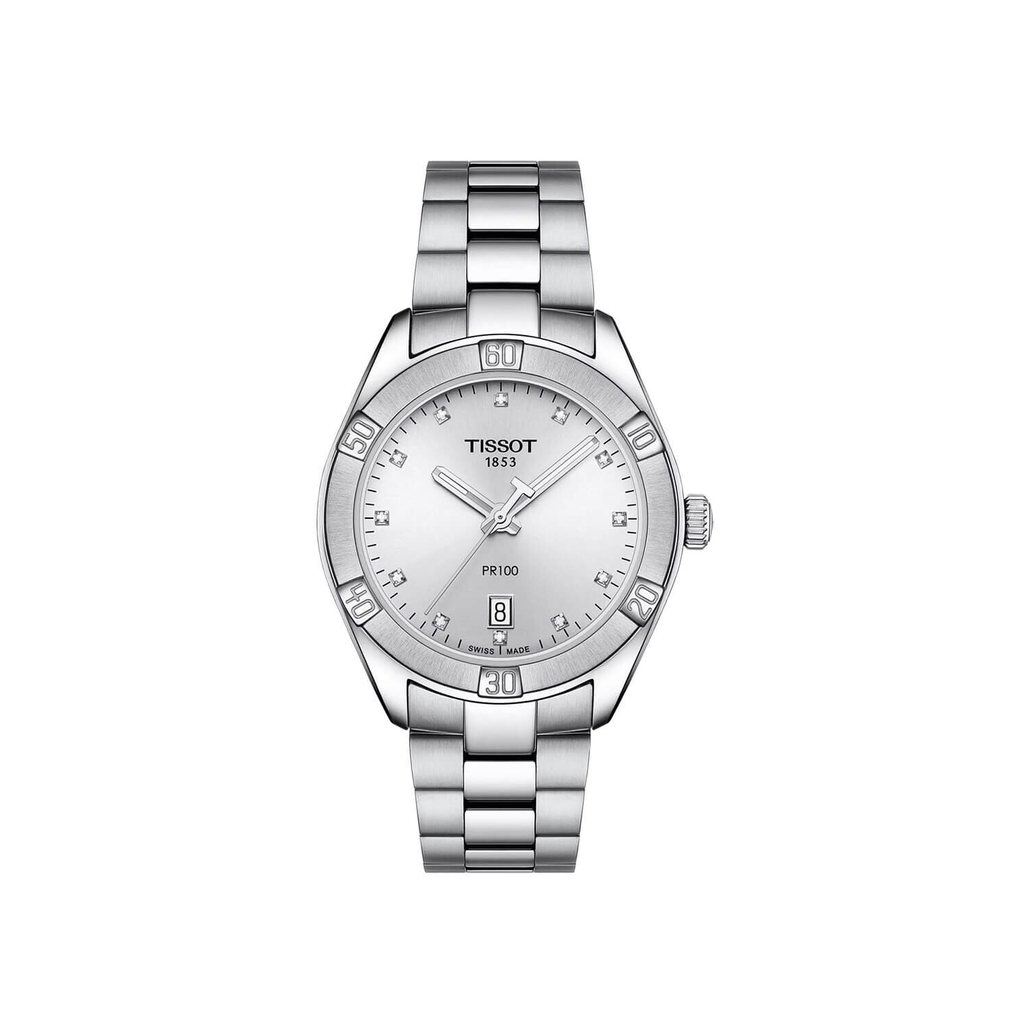 Ce modèle féminin de la collection Tissot PR 100 ("P" pour "Précision", "R" pour "Robustesse" et "100" pour étanche à 100 mètres) se distingue par son boîtier en acier inoxydable 316L et son cadran de couleur argent avec 12 index diamants (totalisant 4,56 centièmes de carat).
